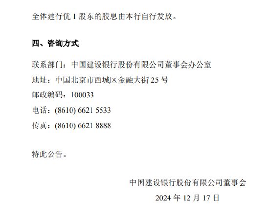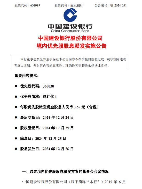 12月17日金融一线音信,开拓银行发布公告九游娱乐(中国)网址在线,按照建行优1票面股息率3.57%计较,每股披发现款股息东谈主民币3.57元(含税)。以建行优1刊行量6亿股为基数,谋略派发现款股息东谈主民币21.42亿元(含税)。 股息披发日为2024年12月26日。